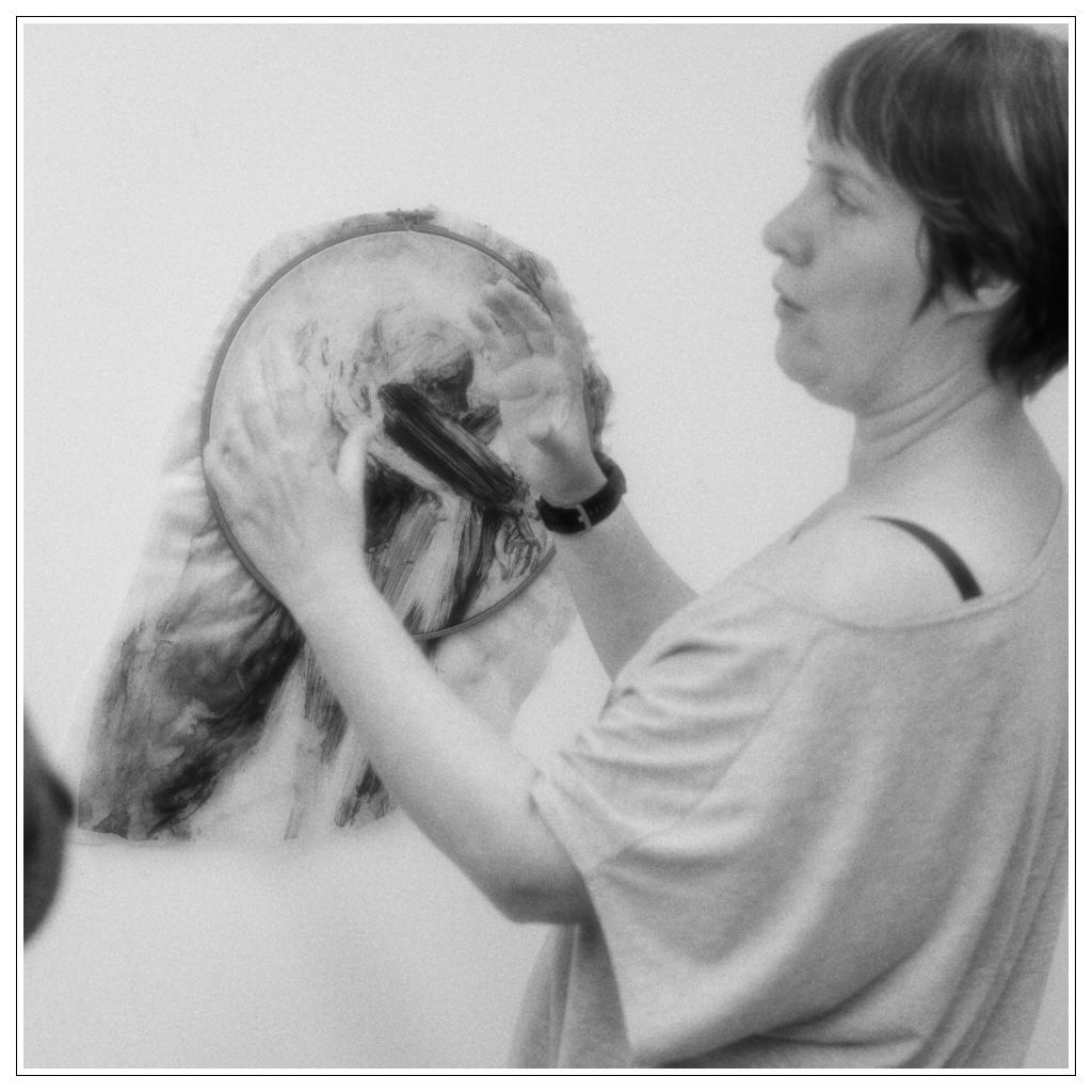 The hoop is really important as a material because it has this big history of women’s domestic work, but its also only a temporary support for an activity inside, it holds something inside but it’s not permanent, it’s also, I’m using it as a focusing tool to get into the middle of the painting.